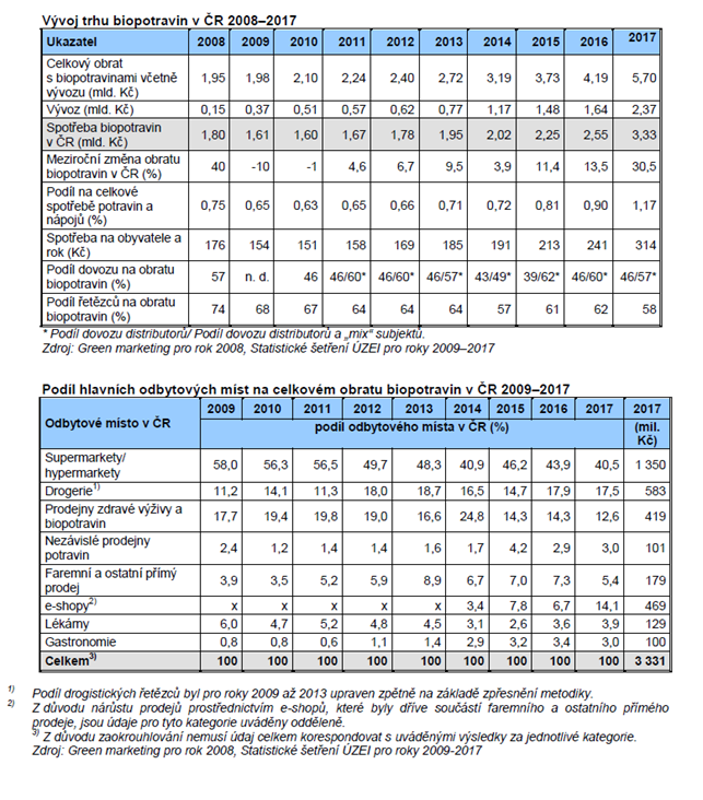 Podíl biopotravin na celkové spotřebě potravin a nápojů v roce 2017 činil 1,17 % a průměrná roční spotřeba vzrostla na 314 Kč na obyvatele. Vysoký meziroční nárůst byl zčásti způsoben zahrnutím většího počtu povinně registrovaných subjektů v ekologickém zemědělství do šetření.