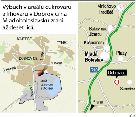 Výbuch části výroby lihovaru v areálu cukrovaru a lihovaru v Dobrovici na Mladoboleslavsku zranil 14 lidí. Nejméně dva lidé jsou zraněni těžce, do nemocnic je přepravily vrtulníky. Na místě je zhruba padesát hasičů. Další exploze nehrozí, požár nevznikl. Jakmile bude místo bezpečné, budou na místě vyšetřovat kriminalisté. Novinářům to na místě řekl mluvčí středočeských hasičů Petr Svoboda. Škody budou zřejmě v milionech.